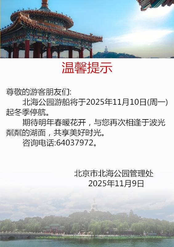 11月9日,北京市北海公园管理处发布关于2025年游船冬季停航的温馨提示: